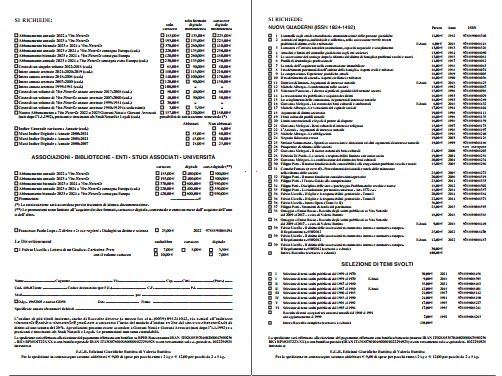 PROMOZIONE (**) PREZZO € T I T O L O CARTACEO DIGITALE ENTRAMBI ABBONAMENTO ANNUALE 2022 185,00 135,00 225,00 ABBONAMENTO ANNUALE 2023 193,00 135,00 225,00 ABBONAMENTO BIENNALE 2023/2024 370,00 260,00 410,00 ABBONAMENTO ANNUALE CONSEGNA EUROPA 2023 220,00 135,00 250,00 ABBONAMENTO ANNUALE CONSEGNA EUROPA 2024 220,00 135,00 250,00 ABBONAMENTO BIENNALE CONSEGNA EUROPA 2023/2024 420,00 260,00 480,00 ABBONAMENTO ANNUALE CONSEGNA ALL'ESTERO 2023 230,00 135,00 250,00 ABBONAMENTO ANNUALE CONSEGNA ALL'ESTERO 2024 230,00 135,00 250,00 COSTO SINGOLO VOLUME 2022-2018 (cad.) 65,00 50,00 80,00 INTERE ANNATE ARRETRATE 2021-2019 (cad.) 180,00 115,00 210,00 INTERA ANNATA ARRETRATA 2018-2008 (cad.) 140,00 100,00 170,00 INTERA ANNATA ARRETRATA 2007-2000 (cad.) 120,00 90,00 150,00 INTERA ANNATA ARRETRATA 1999-1981 (cad.) 100,00 COSTO SINGOLO VOLUME ANNATA ARRETRATA 2017-2008 (cad.) 50,00 40,00 60,00 COSTO SINGOLO VOLUME ANNATA ARRETRATA 2007-2000 (cad.) 40,00 30,00 50,00 COSTO SINGOLO VOLUME ANNATA ARRETRATA 1999-1981 (cad.) 30,00 COSTO SINGOLO VOLUME ANNATA ARRETRATA 1980-1949 (a sedicesimi) 3,00 3,50 ABBONAMENTI GIOVANI NOTAI (nati dopo il 01/01/1992*) 157,00 120,00 180,00 ABBONATI NON ABBONATI INDICE GENERALE CARTACEO - ANNATE (CAD.) 6,00 MAXI INDICE DIGITALE - ANNATE 2000-2021 55,00 60,00 MAXI INDICE DIGITALE - ANNATE 2008-2021 45,00 50,00 MAXI INDICE DIGITALE - ANNATE 2000-2007 18,00 25,00 ASSOCIAZIONI - BIBLIOTECHE - ENTI - STUDIASSOCIATI - UNIVERSITA' T I T O L O CARTACEO DIGITALE ENTRAMBI ABBONAMENTO ANNUALE 2022 185,00 400,00 500,00 ABBONAMENTO ANNUALE 2023 193,00 400,00 500,00 ABBONAMENTO BIENNALE 2023/2024 370,00 600,00 950,00 ABBONAMENTO ANNUALE CONSEGNA EUROPA 2023 220,00 400,00 550,00 ABBONAMENTO BIENNALE CONSEGNA EUROPA 2023/2024 420,00 600,00 950,00 PROMOZIONI** (CHIEDERE INFO) * La rateizzazione sarà accordata previo riscontro di idonea documentazione sui prezzi non scontati. **Le promozione è limitata all'acquisto dei due formati, cartaceo e digitale, contestuale o entro un mese dall'acquisto dell'uno o dell'altro. Francesco Paolo Lops - Il diritto e le sue ragioni - Dialoghi su diritto e scienza 25,00 2022 9788898068494 LE DIVERTISSEMENT audiolibro cartaceo digitale 1 Fulvio Uccella - Lettera di un Giudice - carissimo prete 7,00 5,00 3,50 con il volume cartaceo 10,00 7,00 NUOVI QUADERNI (ISSN 1824-1492) VOLUME TITOLO PREZZO € ANNO ISBN 1 I CONTROLLI SUGLI ATTI DI STRAORDINARIA AMMINISTRAZIONE 11,00 1982 9788898068340 DELLE PERSONE GIURIDICHE 2 AZIENDA E IMPRESA INDIVIDUALE E COLLETTIVA, NELLA 6,00 2018 9788898068418 EBOOK SUCCESSIONE MORTIS CAUSA: PROBLEMI DI DIR. CIVILE E TRIBUTARIO 3 I CONSORZI E L'ATTIVITÀ NOTARILE: COSTITUZIONE, CAPACITÀ 13,00 1983 9788898068326 NEGOZIALE E SCIOGLIMENTO 4 ATTUALITÀ E LIMITI DEL CONTROLLO GIUDIZIARIO SUGLI ATTI SOCIETARI 13,00 1984 9788898068050 5 LA SUCCESSIONE DEL CONIUGE DOPO LA RIFORMA DEL DIRITTO DI 13,00 1985 9788898068081 FAMIGLIA: PROBLEMI VECCHI E NUOVI 6 PROFILI DI DEONTOLOGIA PROFESSIONALE 11,00 1987 9788898068012 7 LA TUTELA DELL'ACQUIRENTE NELLA CONTRATTAZIONE IMMOBILIARE 16,00 1988 9788898068043 8 I TRASFERIMENTI PATRIMONIALI NELL'AMBITO DELLA FAMIGLIA. 16,00 1988 9788898068074 ASPETTI CIVILI E TRIBUTARI 9 LA COOPERAZIONE. ESPERIENZE GIURIDICHE ATTUALI 16,00 1989 9788898068005 10 IL TRASFERIMENTO DI AZIENDA. ASPETTI CIVILISTICI E TRIBUTARI 16,00 1990 9788898068036 11 DIRITTI REALI LIMITATI. ARGOMENTI DI INTERESSE NOTARILE 5,00 2018 9788898068425 EBOOK 12 I CONFERIMENTI NELLE SOCIETA' - MICHELE ALBERGO 15,00 1992 9788898068067 13 I DIVERSI SIGNIFICATI GIURIDICI DEL TERMINE SOCIETA' 15,00 1996 9788898068098 - VINCENZO PANUCCIO 14 LA TRASCRIZIONE FRA PUBBLICITÀ E ACQUISTO DEI DIRITTI 16,00 1993 9788898068029 15 LO SCIOGLIMENTO DELLE COMUNIONI. ARGOMENTI DI INTERESSE NOTARILE 16,00 1993 9788898068289 16 LO STATUTO DEI BENI CULTURALI E AMBIENTALI - GIOVANNA MELEGARI 6,00 2018 9788898068432 EBOOK 17 LE VARIAZIONI DEL CAPITALE SOCIALE - MICHELE ALBERGO 17,00 1994 9788898068104 18 ARGOMENTI DI DIRITTO SOCIETARIO 19,00 1996 9788898068111 19 I BENI CULTURALI: PROFILI NOTARILI 16,00 1996 9788898068135 20 LIMITI CONVENZIONALI E LEGALI AL POTERE DI DISPORRE 16,00 1998 9788898068159 21 BENI CULTURALI DI INTERESSE RELIGIOSO - GIOVANNA MELEGARI 15,00 1997 9788898068173 22 L'AZIENDA. ARGOMENTI DI INTERESSE NOTARILE 19,00 1998 9788898068197 23 LE OBBLIGAZIONI. - MICHELE ALBERGO 26,00 1998 9788898068210 24 NEGOZIO FIDUCIARIO E TRUST 19,00 2003 9788898068128 25 SPUNTI SU SUCCESSIONI E DONAZIONE E ALTRI ARGOMENTI DI INTERESSE 19,00 1999 9788898068166 NOTARILE - STEFANO SAMMARTANO 26 PROSPETTIVE DI RIFORMA DELLE SOCIETA' (CORSO STAMPA) non stampato 27 IL NUOVO STATUTO DEI BENI CULTURALI - GIOVANNA MELEGARI 21,00 2000 9788898068203 28 LA SOCIETA' A RESPONSABILITA' LIMITATA CON UNICO SOCIO 19,00 2001 9788898068258 - FABRIZIO DI PAOLO 29 LA CODIFICAZIONE DEL DIRITTO DEI BENI CULTURALI 20,00 2004 9788898068234 30 IL MUTUO FONDIARIO DALLA CONCEDIBILITA' ALLA EROGAZIONE: 15,00 2005 9788898068296 PROBLEMI VECCHI E NUOVI - FILIPPO PATTI 31 PROCEDIMENTI DECISIONALI E TUTELE DELLE MINORANZE NELLA RIFORMA 25,00 2005 9788898068272 DELLA SOCIETÀ 32 IL MUTUO FONDIARIO: CONSIDERAZIONI OPERATIVE - FILIPPO PATTI 20,00 2006 9788898068319 33 I TRUSTS: GUIDA ALLA COMPRENSIONE - FILIPPO PATTI 25,00 2011 9788898068333 34 DISCIPLINA DELLE AREE DI PARCHEGGIO - FILIPPO PATTI 18,00 2012 9788898068302 35 LA RISOLUZIONE PER MUTUO CONSENSO - ART.1372 C.C. - FILIPPO PATTI 18,00 2014 9788898068357 36 IL FIGLIO E LA RESPONSABILITA' GENITORIALE - TOMO I - FULVIO UCCELLA 20,00 2014 9788898068364 36 IL FIGLIO E LA RESPONSABILITA' GENITORIALE - TOMO II - FULVIO UCCELLA 22,00 2014 9788898068371 36 INTERA OPERA (TOMI I + II) - FULVIO UCCELLA 36,00 37 FILIPPO PATTI - STRUMENTI DI TUTELA DEL PATRIMONIO 25,00 2015 9788898068593 38 OMAGGIO A ENNIO RUSSO - RACCOLTA DEGLI SCRITTI PUBBLICATI 16,00 2018 9788898068388 SU VITA NOTARILE DAL 2009 al 2017 - a cura di Valeria Buttitta 38 OMAGGIO A E
